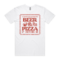 BEER AND PIZZA - MEN`S WHITE T-SHIRT - FRONT PRINT